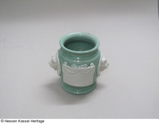 Steingut, Reliefdekor, hellgrün und weiß glasiert.