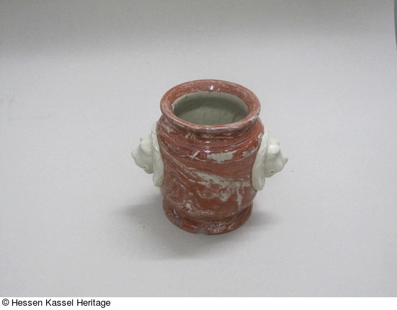 Steingut, Reliefdekor, rötlich marmoriert und weiß glasiert.