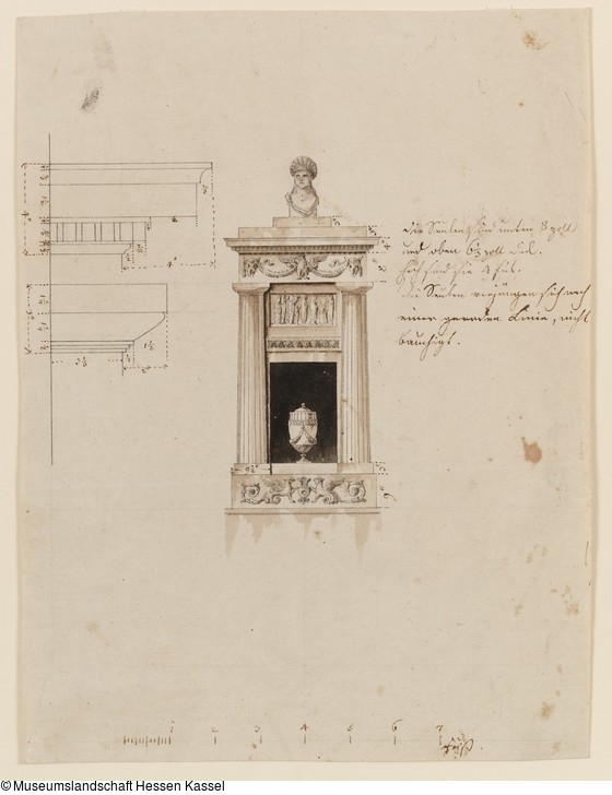 mittig rechts: "die Säulen sind unten 8 zoll / und oben 6 1/3 zoll dick. / hoch sind sie 4 fus. / die Säulen verjüngen sich nach / einer geraden Linie, nicht / bauchigt." (mit Feder in Braun);
