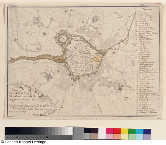 rechts: Kartenlegende (Feder in Schwarz); oben links: 6. Carvanti (Feder in Braun); links unten in einer Kartusche: Fait par i.d.i. Amport / Lieut: de l´Artill: hess. (Feder in Schwarz); links unten in einer Kartusche: Couleurs. Places bruleès de la Ville dans / le Siege du 3me 7br 1759. Places endomageès / dans le meme Siege. (Feder in Schwarz); links unten in einer Kartusche: Plan / de le Ville et Citadelle / de Munster, avec les For- / tresses neuves et la Situati- / on. (Feder in Schwarz);