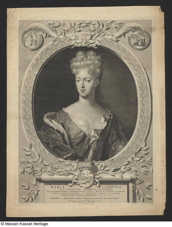unten rechts: F. Halma excudit cum Privil. (Radierung); Signatur: unten mittig: P. van Gunst sculp. (Radierung); Signatur: unten links: Volders pinxit. (Radierung); unten mittig: Illustrimis ac Praepotentibus Frisiae Ordinibus summa animi devotione D. D. D. / obsequentissimus atque humillimus cliens. / FRANCISCUS HALMA. (Radierung); unten mittig: MARIA LUDOVICA, / D. G. PRINCEPS AURIACO - NASSAVIA, / EX SERENISSIMA HASSIAE LANDGRAVIORUM STIRPE, MATER AC TUTRIX GUILIELMI / CAROLI HENRICI FRISONIS, D. G. PRINCIPIS AURIACI ET NASSAVII, / GUBERNATORIS FRISIAE HAEREDITARII, etc, etc, etc. (Radierung);