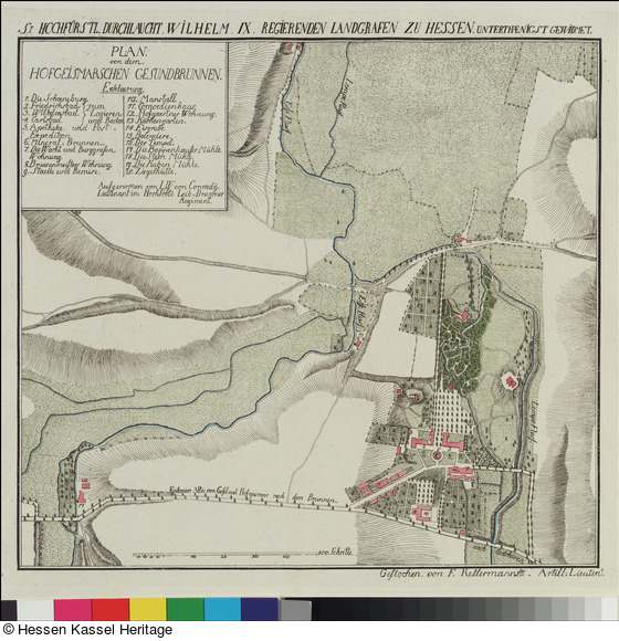 | Beschriftungen: | oberer Darstellungsrand: Sr HOCHFÜRSTL. DURCHLAUCHT. WILHELM. IX. REGIERENDEN LANDGRAFEN ZU HESSEN. UNTERTHAENIGST GEWIDMET. (Kupferstich); oben links: PLAN / von dem / HOFGEISMARSCHEN GESUNDBRUNNEN. (Kupferstich);