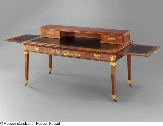 Flacher, langgestreckter Schreibtischaufsatz mit je einer seitlichen Schublade und offener Mitte. Fronten der Schubladen mit vergoldeten Beschlägen: mittig Knopf mit Reliefdekor, seitlich symmetrisch angeordnet stilisiertes Palmettenmotiv. Einfache rechteckige Abdeckplatte über vorkragender profilierter Kranzleiste. Auf der Unterseite der linken Schublade beschriftet: Fr. Wichmann zu Cassel den 25ten Febr. 91.