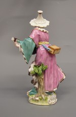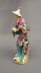 Hohler Natursockel mit Rocaillen belegt, dazwischen Pflanzenbüschel. Der Malabare in durch Bewegung flatterndem, innen pelzbesetztem Mantel, stellt den linken Fuss vor, hält die Laute weit nach links hinüber und wendet den Kopf mit geöffnetem Mund singend nach seiner rechten Seite. Farben: gelbgrün bis laubgrün, am Sockel Rocaillen in Weiß und Gold. Untergewand türkis mit blasspupurnem Futter. An den Ärmeln Mantel hellpurpur mit bräunlich weißem Futter, gelbe Schärpe mit braunen Streifen, ein am Gürtel hängendes Kästchen, heller und kräftiger bräunlich mit Goldverschluss, das Band blau und bläulich verlaufendes Weiß. Laute kräftig braun marmoriert, Gold am Steg und am Schalloch. Aus dem Sockel rückwärts herauswachsend kleine Baumstütze, die bis zur Schenkelhöhe reicht. Leichte Färbung in bräunliche und gelblichen Tönen mit grünem Laub.
