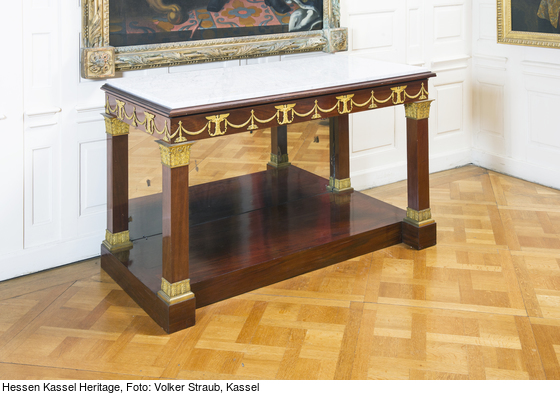 Spiegelkonsole auf längsrechteckiger Sockelplatte mit vorspringenden quadratischen Ecken. Darauf und an der Rückseite erheben sich vier hohe Pfeiler mit bronzenen akanthusblattverzierten Basen und Kapitellen. Rückwand verspiegelt. Hohe glatte Zarge, auf drei Seiten mit einem bronzenen Fries versehen: vier bzw. zwei (an den Seiten) geflügelte Mischwesen, die aus Akanthusblättern herauswachsen, im Wechsel mit fünf bzw. drei Kandelabern. Zwischen den Motiven hängende Blütengirlanden, die in den Händen der Mischwesen in Banderolen auslaufen. Vorspringende profilierte Deckplatte; Marmorplatte mit Einfassung ergänzt.