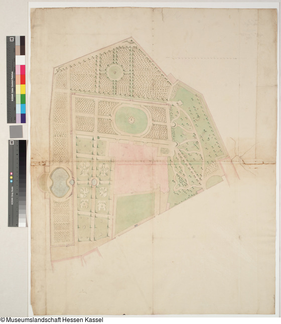 unten rechts: "MORSCHEN-ALTMORSCHEN" (mit Kugelschreiber); verso: "Plan / vom Schloßgarten zu Heydau. / K.F. Minist. Abth. f. d. Dom. [...] / VI. 5. m." (mit Feder in Braun); verso: "Plan / vom Herrschafft. Garten zu Heydau" (mit Graphit); verso: "Schloß Heidau" (mit Graphit); verso: "Inv. IV Do 7" (mit Graphit);