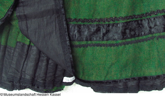 Olivgrüner Rock, gefältet, mit schwarzen Borten (u. a. Perlenborte) im unteren Bereich, Saumbesatz innen: schwarzer Stoff.