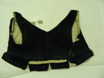 Dunkelblaues Plüschleibchen mit verzierten Knöpfen, bunt gesäumten Knopflöchern.