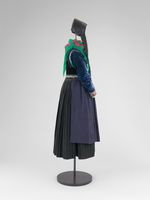 Dunkelblaue Schürze mit bunten Bortenbändern, Bund ebenfalls mit Borte besetzt.