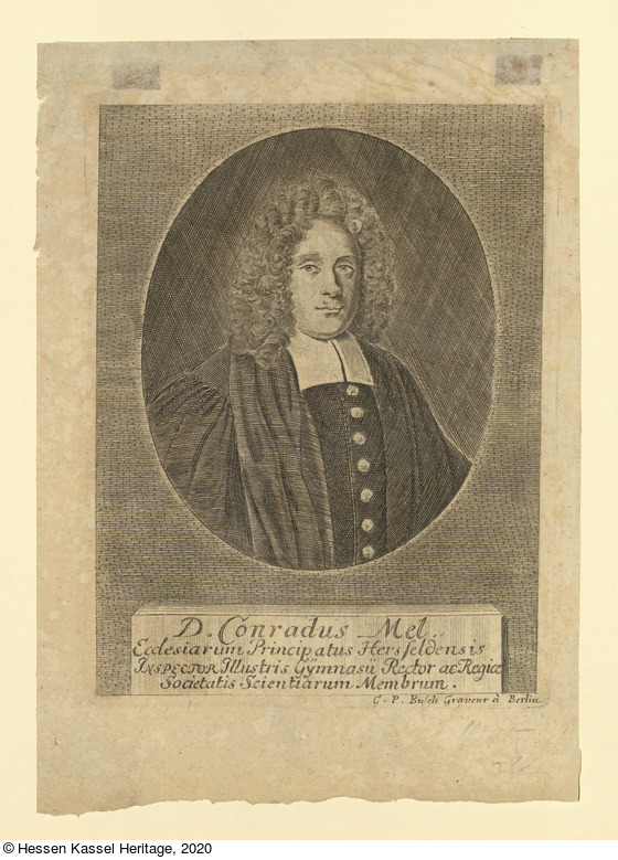 Bezeichnung: im Sockel: D. Conradus Mel. / Ecclesiarum Principatus Hersfeldensis / INSPECTOR Illustris Gymnasü Rector ac Regiae / Societatis Scientiarum Membrum. (Kupferstich); Bezeichnung: unten rechts: G.P. Busch Graveur à Berlin. (Kupferstich);