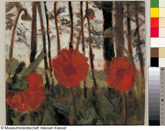 Aufkleber: verso auf dem Keilrahmen Klebezettel: Galerie Axel Vömel Düsseldorf P.Modersohn-Becker 1876-1907 Nr. Am Gehölz. Oel um 1902 Photo E. 4589 oenn; verso mit schwarzem Stift "No. [?]65"; verso mit blauem Buntstift "55)"; verso mit rotem Buntstift und umrandet "214" (dabei ist die 2 über eine 1 geschrieben); verso mit schwarzem Stift "29,8 X 33,7 [Maßangabe]; verso mit schwarzer Tinte "Umseitiges Gemälde / "Rote Blumen (Mohnblumen) am Gehölz" / ist meines Wissens und meiner Überzeugung nach / ein eigenhändiges Werk] von / Paula Modersohn-Becker, / das trotz seines Studien-Charakters als ein vollgültiges / Zeugnis ihrer Kunst zu gelten hat. (Entstehungszeit um 1902) Bremen, den 4-VIII-1961 / Dr. Günter Busch"; ;