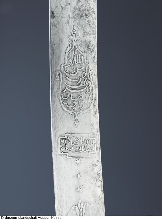 auf Erden. Wer i (geätzt); Auf der anderen Klingenseite in einer tropfenförmigen: „Beistand von Allah