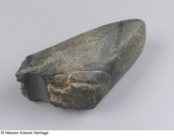 Vorderer Teil einer facettierten, in der Bohrung gebrochenen Steinaxt aus grünlichem Felsgestein.