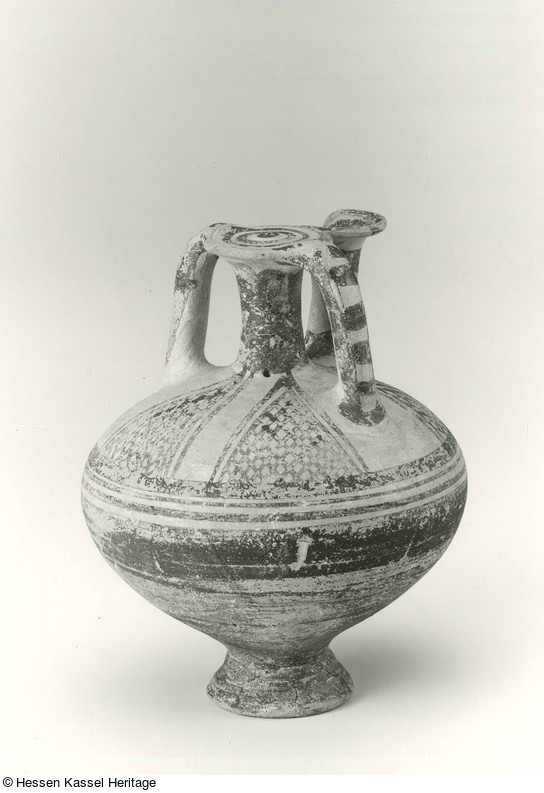 Die Bügelkanne stellt eine Leitform der mykenischen Vasen dar. Die gegitterten Dreiecke gehören dem spätesten Dekorstil an. Das wohl auf Zypern hergestellte Gefäß zeigt die sehr engen Beziehungen zum mykenischen Griechenland auch in dieser Periode des Übergangs von der Bronzezeit zur Eisenzeit.