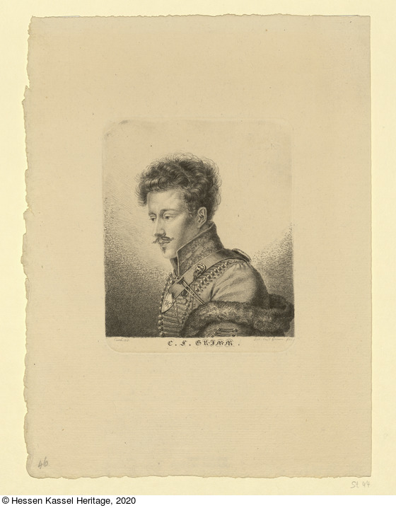 Carl Friedrich Grimm als Kurhessischer Jäger, Porträt im Dreiviertelprofil nach links (Stoll 44) |