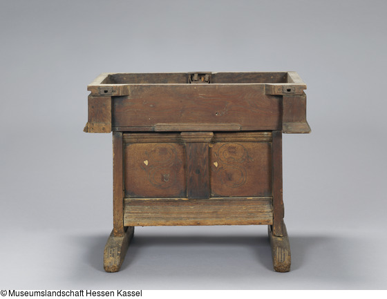 Über zwei Fußstollen Tisch von krippenartigem Querschnitt (unten). Die Platte (mit Schlosskrampe vorn) schiebt sich in Rinnen über die Breite ihrer Unterlage hinweg nach hinten und deckt dadurch den Tischkasten auf. In dessen Boden Handloch zum Durchgreifen in den darunterliegenden Trogkasten. Die zur Stützung der zurückgeschobenen Tischplatte dienenden Flügel sind bis auf Pfostenlöcher verschwunden. Kastenwand nach hinten durch Pilaster halbiert, Felder mit geritzten Ranken und eingelegter Blume geschmückt. Nach vorn Kastenseitenwände konsolartig vorgezogen. Vorderwand glatt. Der Tisch steht hohl.