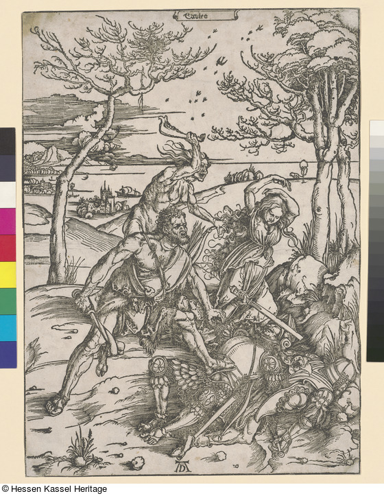 Signatur: unten mittig in der Darstellung: AD (Holzschnitt); oben mittig in der Darstellung: Ercules; verso unten links: DrGuérand (mit Bleistift);