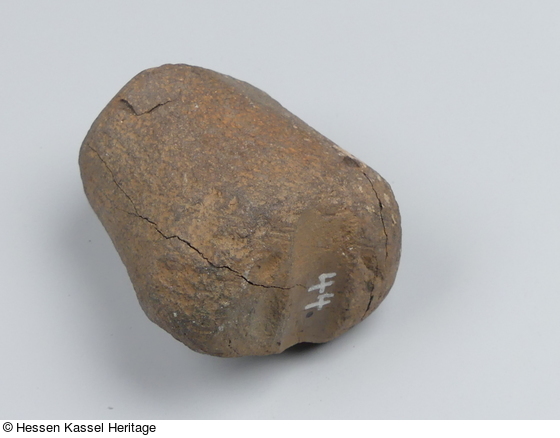 Steinaxtfragment, in der Durchbohrung gebrochen, nur das stark bestoßene Nackenteil erhalten. Bereich der Durchbohrung offenbar verdickt. Durch Magazinbrand im 2. Weltkrieg zusätzliche Schäden