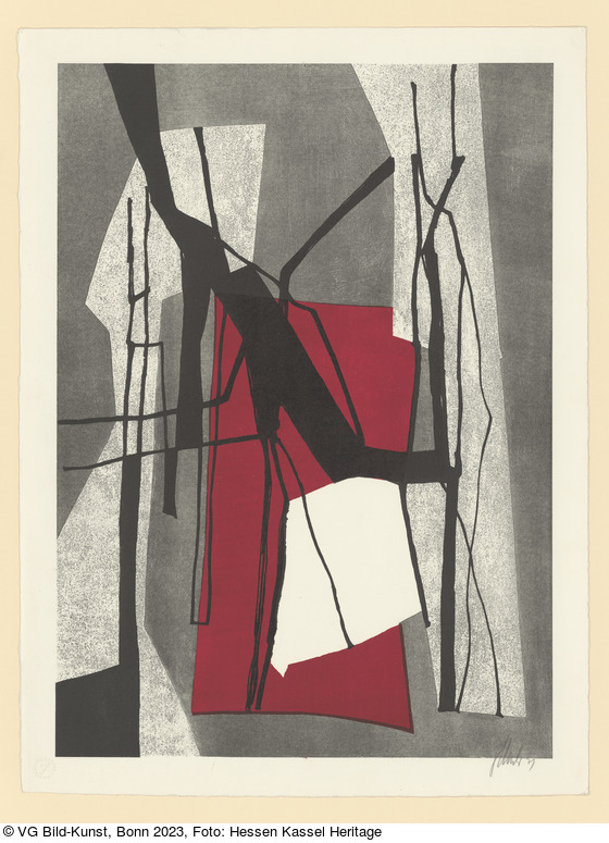 Lithographie in Schwarz, verschiedenen Grauwerten und Karminrot auf Papier |