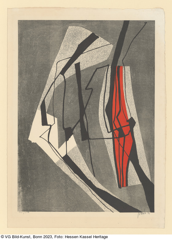Lithographie in Schwarz, verschiedenen Grauwerten und Hellrot auf Papier |