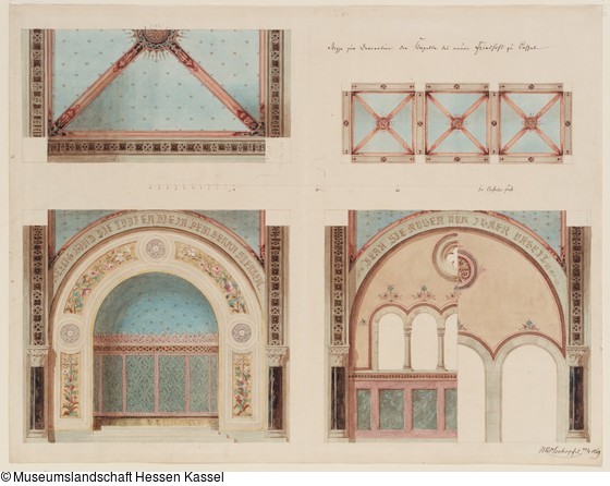 Signatur: oben rechts: Skizze zur Decoration der Kapelle des neuen Friedhofes zu Cassel (mit Tinte in Schwarz); Signatur: unten rechts: H. R. Hochapfel 22/4 1869.;
