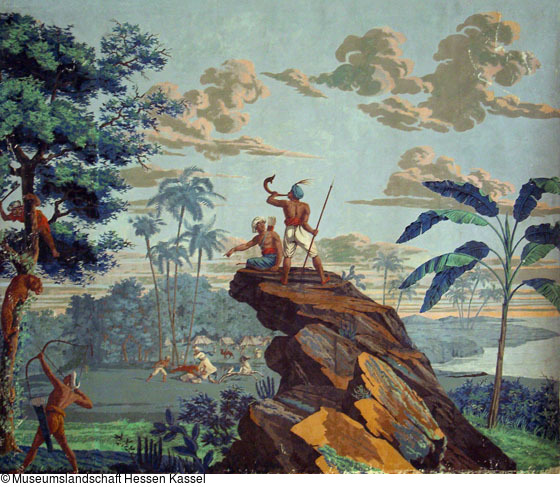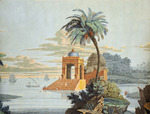 Panoramatapete "Grande Chasse au Tigre dans l'Inde" ("Vues de l'Inde"), Bahn 0-5 (Blick auf Ganges mit Tempel), Bahn 6-9 (Jagdszene)