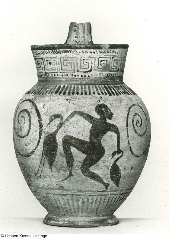 Das Motiv eines laufenden Mannes ist typisch für den figürlichen Dekor der Fikellura-Gattung. Die "negroide" Figur und die zwei toten (?) Kraniche deuten vielleicht auf den sagenhaften Kampf der "Pygmäen" mit den Kranichen hin.