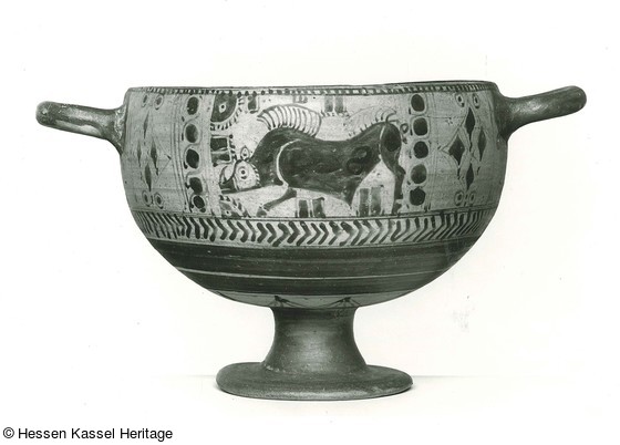 Das dünnwandige Gefäß hat ein tiefes, halbkugelförmiges Becken, zwei Horizontalhenkel und einen hohlen Fußstiel auf einer flachen Standplatte. Über dem dunkelbraunen Fuß ist am Körperansatz ein strichgefüllter Strahlenkranz gemalt, darüber folgen dunkle, rot und weiß bemalte Bänder und eine Winkelreihe, auf welcher die drei Dekorfelder der Henkelzone stehen. In der Frontmitte springt ein Stier nach links; auf der Rückseite greift ein Eber mit hohem Kamm nach links an; Füllornamente begleiten beide Tiere. Die Tierkörper sind in ausgefüllter Silhouette mit aufgesetztem Dunkelrot, ihre Köpfe in Umrißzeichnung ausgeführt. Die Seitenfelder, abgetrennt durch vertikale Flecht- und Mäanderbänder, füllen Kreuzblätter, Rauten, Punktkreise. Die Schaleninnenseite ist mit braunern Malton überzogen und mit zwei dunkelroten, von weißen Linien eingefaßten Bändern sowie einem Kreis in der Mitte verziert.
