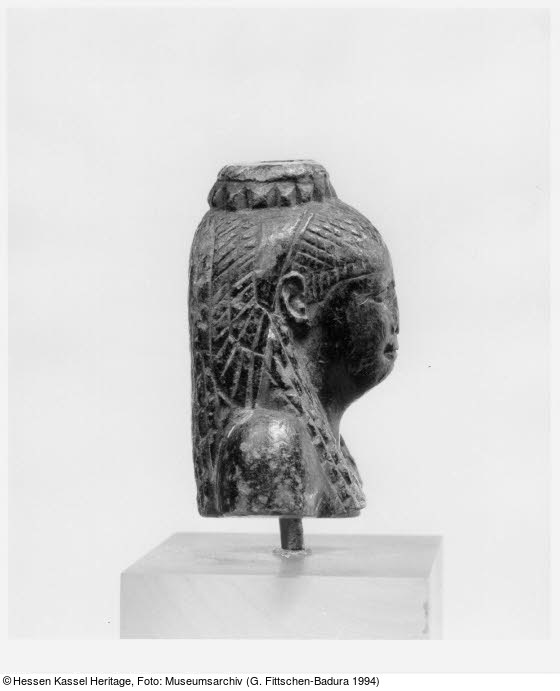 Der Kopf mit Büste stammt von einer ursprünglich ca. 20 cm hohen Statuette, die vermutlich eine ptolemäische Königin in langem, eng anliegendem Gewand darstellte. Sie trägt eine langsträhnige Perücke. Das Haar auf dem Oberkopf ist durch ein graviertes Rautenmuster angegeben; die nach vorn fallenden Perückenstränge und das Haar hinten sind in keil- bzw. quaderförmige Lockensträhnen untergliedert. Seitlich hinter den Ohren bedecken die Flügel einer Geierhaube den Kopf. Auf der Kalotte hat sich der Uräenkranz erhalten, in den die verlorene Hathor-Isis-Krone – bestehend aus Kuhgehörn, Sonnenscheibe und hohen Straußen- oder Falkenfedern – eingezapft war. Der Kopfschmuck wurde in Kombination mit der Geierhaube von Königinnen und Prinzessinnen seit der 18. Dynastie getragen, in der Spätzeit auch von den königlichen Hohepriesterinnen des thebanischen Amunkultes. Mit dieser Kompositkrone schmückten sich auch die seit Arsinoe II. an Isis angeglichenen, vergöttlichten Königinnen der Ptolemäer. Das porträthaft gestaltete Gesicht einer bestimmten Ptolemäerin zuzuweisen, ist wegen seiner Ausführung im ägyptischen Stil schwierig. Der stämmige Hals mit angedeutetem Doppelkinn, das volle, gelängte Untergesicht, in das der Mund mit leicht aufgeworfenen Lippen eingebettet ist, sind Merkmale ägyptischer oder ägyptisierender Bildnisse der Arsinoe II. (278–270/68 v. Chr.), die allerdings eine andere Kompositkrone schmücken. Die physiognomischen Details sind zudem wegen der bescheidenen Qualität der Statuette nicht signifikant genug und schließen auch die Wiedergabe einer späteren Ptolemäerin des 2. bis 1. Jhs. v. Chr. nicht aus (Felgenhauer 1996).