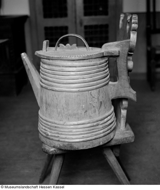 "Alte Gilbe von 1850 aus Wiera. Die Gilbe hat keine Bemalung, jedoch noch den verschließbaren Deckelverschluß, wie er ehedem überall üblich war."