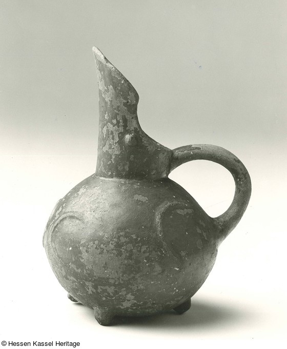Das handgeformte Gefäß mit kugelförmigem Körper steht auf drei kleinen Füßen. Der röhrenförmige Hals setzt sich vom Körper ab; vorne steigt er steil an und mündet in einen hochgezogenen Ausguß; hinten ist er tief gekehlt bis zum Ansatz des Stabhenkels mit Mittelgrat; seitlich sind je ein plastischer Knopf (,Auge') angefügt. Zwei gegenständige, plastische Halbkreise schmücken die Front des Gefäßkörpers und je einer die Seiten neben dem Henkelansatz.