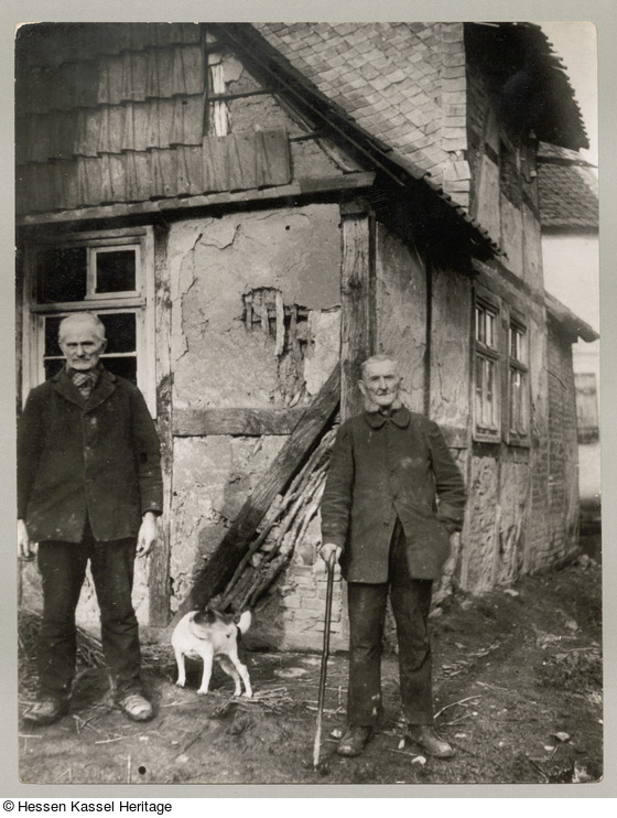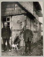 Der Glaser Schüler (links; vgl. VK-X-7-105/5) und der Kleinbauer Philipp Koch (vgl. VK-X-7-111/35) vor dessen Alten-Wohnsitz in der Triftstraße in Calden. Das Haus besaß keinen Schornstein, der Rauch stieg aus dem Oberfenster. Philipp Koch, der ursprünglich aus einem Hof im Oberweg stammte, war durch einen Dreschunfall infolge Versicherungskosten verarmt. Glaser Schüler und Kleinbauer Koch waren Nachbarn.