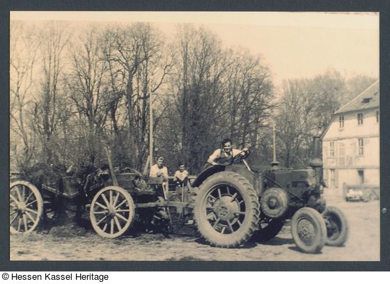 Mistfahren mit Lanz auf der Domäne Wilhelmsthal. Auf dem Lanz Heinz Dinges (Pächterfamilie Dinges), beim Aufladen Gespannführer Johne und Hans Sommerlade. Im Hintergrund die Gastwirtschaft Wilhelmsthal.