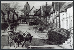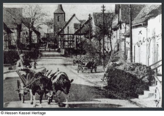 Die Wilhelmsthaler Straße in Calden, früher ‚Oberste Gasse’ genannt. Links das alte Wasserhäuschen an der Einbiegung zum Hohlen Weg.