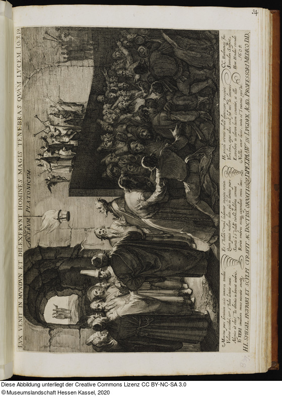 | Hist. Inhaltsverzeichnis: | 34 | l’Antre de Platon; T. Antrum Platonicum; au / haut: Lux venit in mundum etc. au bas 12 / vers: Maxima pars hominum – rationis egestas | C. C. Harlemensis. | J. Saenredam sc. Henr. / Hondius exc. 1604. |