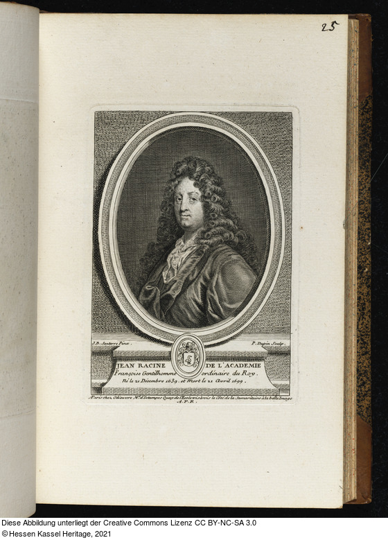 in der Platte: J. B. Santerre Pinx.; P. Dupin Sculp.; JEAN RACINE DE L'ACADEMIE Françoise Gentilhomme ordinaire du Roy. Né le 21 Décembre 1639. et Mort le 21 Avril 1699.; AP[ligiert]aris chez Odieuvre M.d d'Estampes Quay de l'Ecole vis a vis le Côté de la Samaritaine à la belle Image A. P. R.;