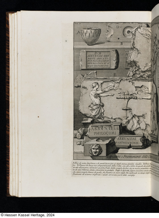 Beschriftungen: in der Platte: Tom. II. XV; [...]ERT ET MILIAE ... ARRVNTIAE PARTHENIONENSIS; Iscrizioni e Frammenti delle Camere sepolcrali della Famiglia Arrunzia ec.; Piranesi Arch.to dis. e sc.; Barbault scolp. le Fig.; A Vasi di creta finissima, ... servivano per li detti sacrificj.;