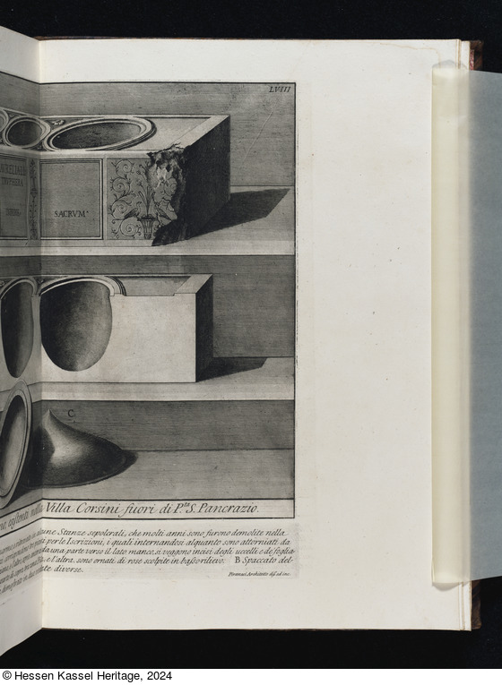 Beschriftungen: in der Platte: Tom. II. LVIII; DIS. AVRELIA L L TRVPHERA INFERIS. SACRVM; Pile cinerarie di marmo, esistente nella Villa Corsini fuori di P.ta S. Pancrazio.; Pile cienerarie, scavate ... due vedute diverse.; Piranesi Architetto dis. ed inc.;