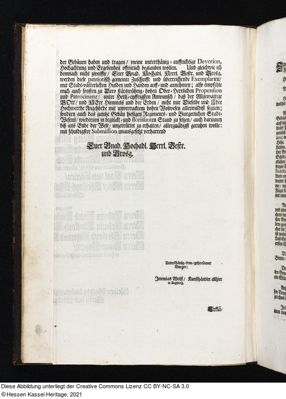 Typendruck: Hoch=Edelgebohrene/ ... Unterthaenig=treu=gehorsamer Burger: Jeremias Wolff / Kunsthaendler allhier in Augspurg.; Erklae=;