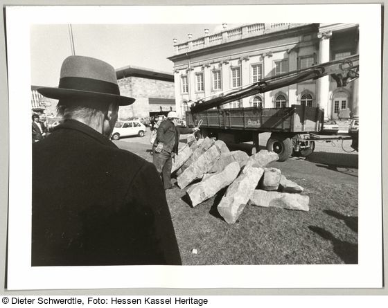 Beim Abladen der ersten Basaltstelen auf dem Friedrichsplatz, Joseph Beuys, Fotodokumentation "7000 Eichen", documenta 7 |
