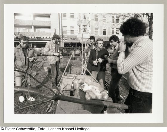Pflanzung Bebelplatz, Pflanztrupp bei der Frühstückspause, Fotodokumentation "7000 Eichen", documenta 7