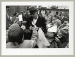 Bezeichnung: Nach der Pflanzung des 3500. Baumes Joseph Beuys gibt Autogramme auf Schülerzeichnungen, Fotodokumentation "7000 Eichen", documenta 7