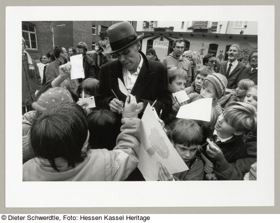 Beschriftungen: Aufkleber: verso: 7000 Eichen / Nach der Pflanzung des 3500. Baumes Joseph Beuys gibt Autogramme auf Schülerzeichnungen / 10.11.84 / A 77a (mit Schreibmaschine);