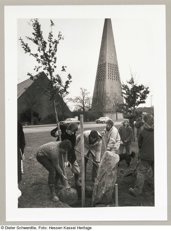 Bezeichnung: Pflanzung des tausendsten Baumes, Eugen-Richter-Straße, Fotodokumentation "7000 Eichen", 1.12.1982, documenta 7