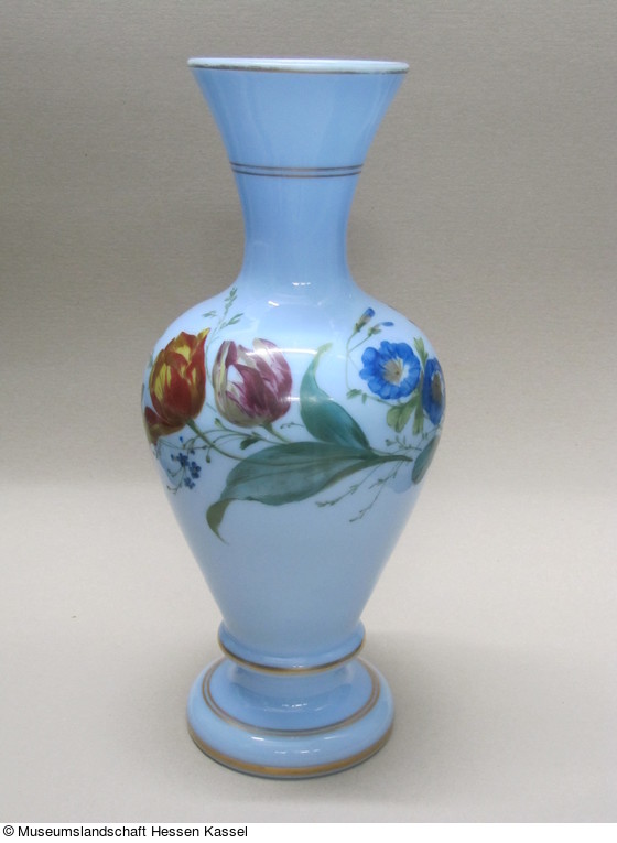 Hellblaues Milchglas, polychrome Emailmalerei, Vergoldung. |