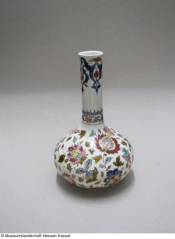 Steingut, crèmefarbener Scherben, mehrfarbiger Dekor in orientalisierender Art, goldkonturiert. |