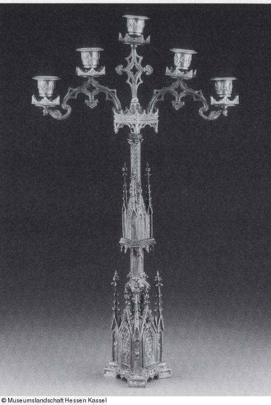 Die Rückbesinnung der um 1800 entstandenen Romantik auf das Mittelalter, in deren Folge auch Renaissance und Barock eine neue Wertschätzung erfuhren, führte im Kunstgewerbe bis etwa zum Ende des Jahrhunderts zur Popularität historisierender Formen. – Der Leuchter besteht aus grazil geformten Elementen gotischer Architektur wie maßwerkverzierten Filialen, Spitzbögen und Kreuzblumen. Die gestaffelte Anordnung der Kerzen findet sich ähnlich bei großen schmiedeeisernen Leuchtern der Gotik.