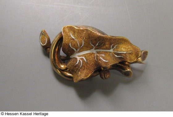 Silbervergoldete Brosche in Form eines länglichen Blattes, das durch einen zusammengebogenen Blattstiel gesteckt ist |