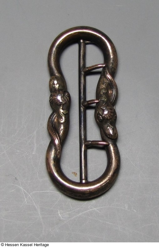 Kleine, silbervergoldete Gürtelschnalle aus zwei in sich verbissenen Schlangen