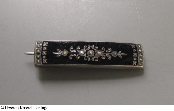 Schmale, querrechteckige Brosche aus Silber mit Blatt- und Blütenornamenten auf schwarzem Email (Trauerschmuck)